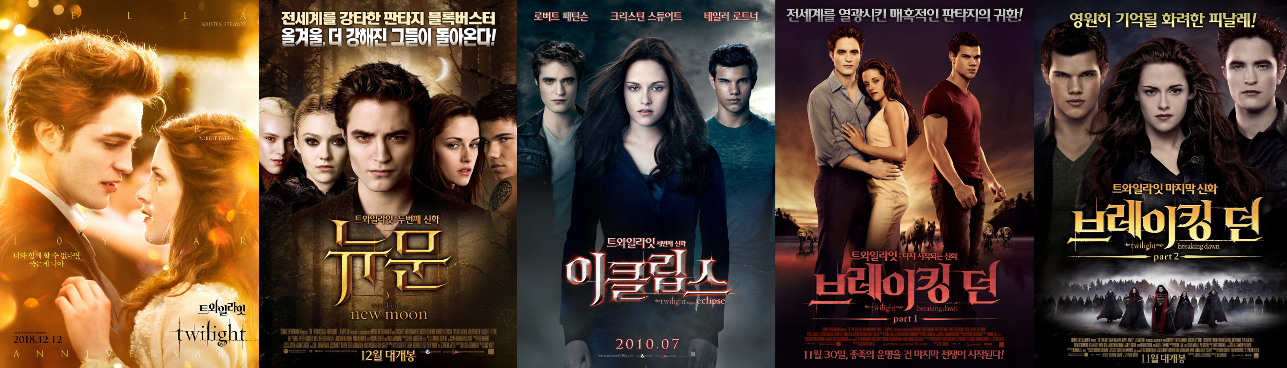 -브레이킹 던 Part. 1(2011): 벨라와 에드워드는 결혼하고, 행복한 신혼여행을 떠난다. 허니문에서 벨라는 예상치 못하게 반은 인간이고 반은 뱀파이어인 아이를 임신하게 된다. 아이는 뱃속에서 엄청난 속도로 성장하고, 벨라의 생명에 위험을 초래한다. 여러 위험요소 속에서도 벨라는 아이를 지키키 위해 필사적으로 노력한다.